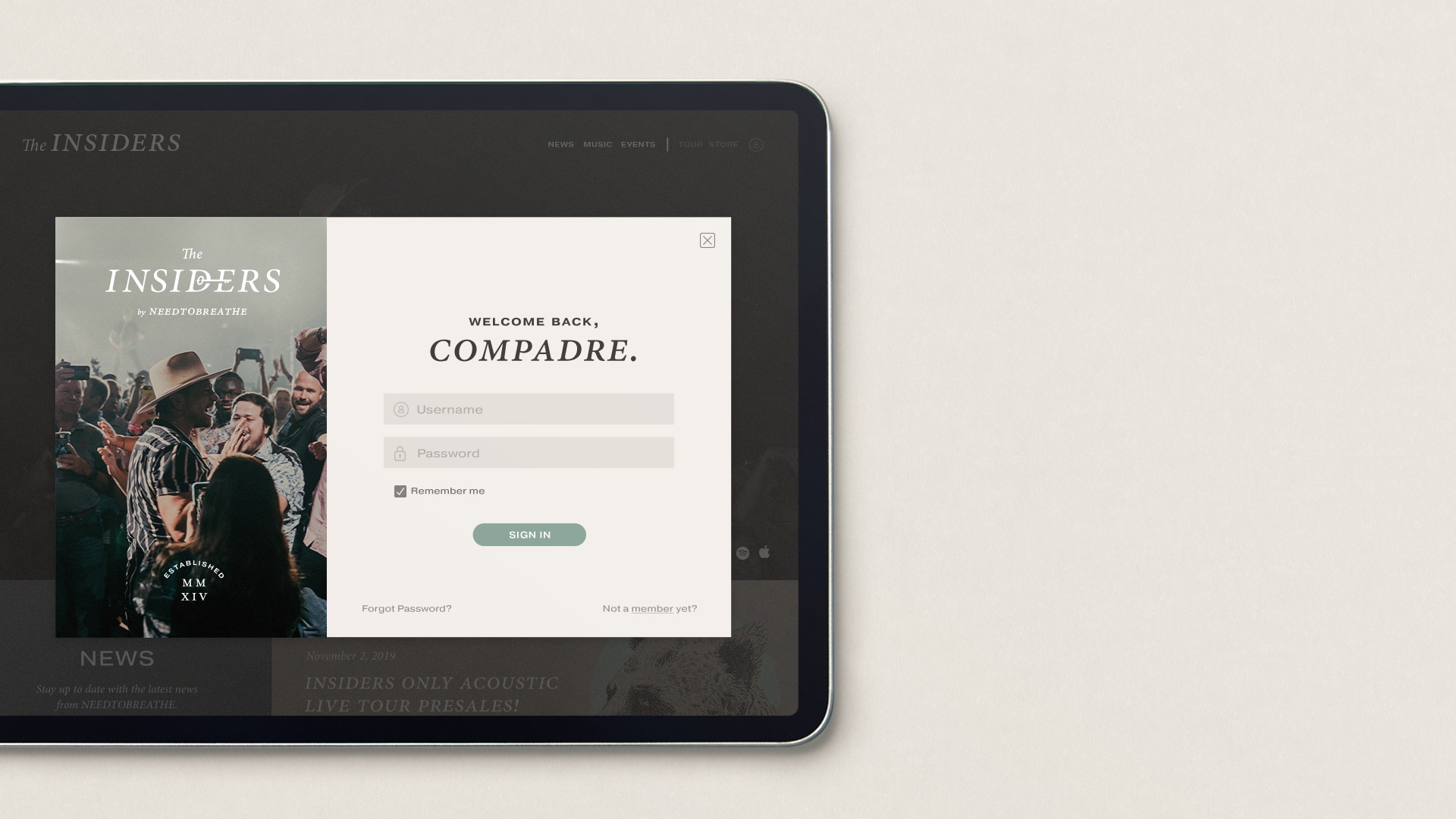 NEEDTOBREATHE is a Grammy-nominated band with a loyal fan base known as The Insiders. Asked to activate The Insiders through a custom digital experience, we aimed to give fans the feeling of having a backstage pass, complete with exclusive content and members-only access to band updates and engagement.