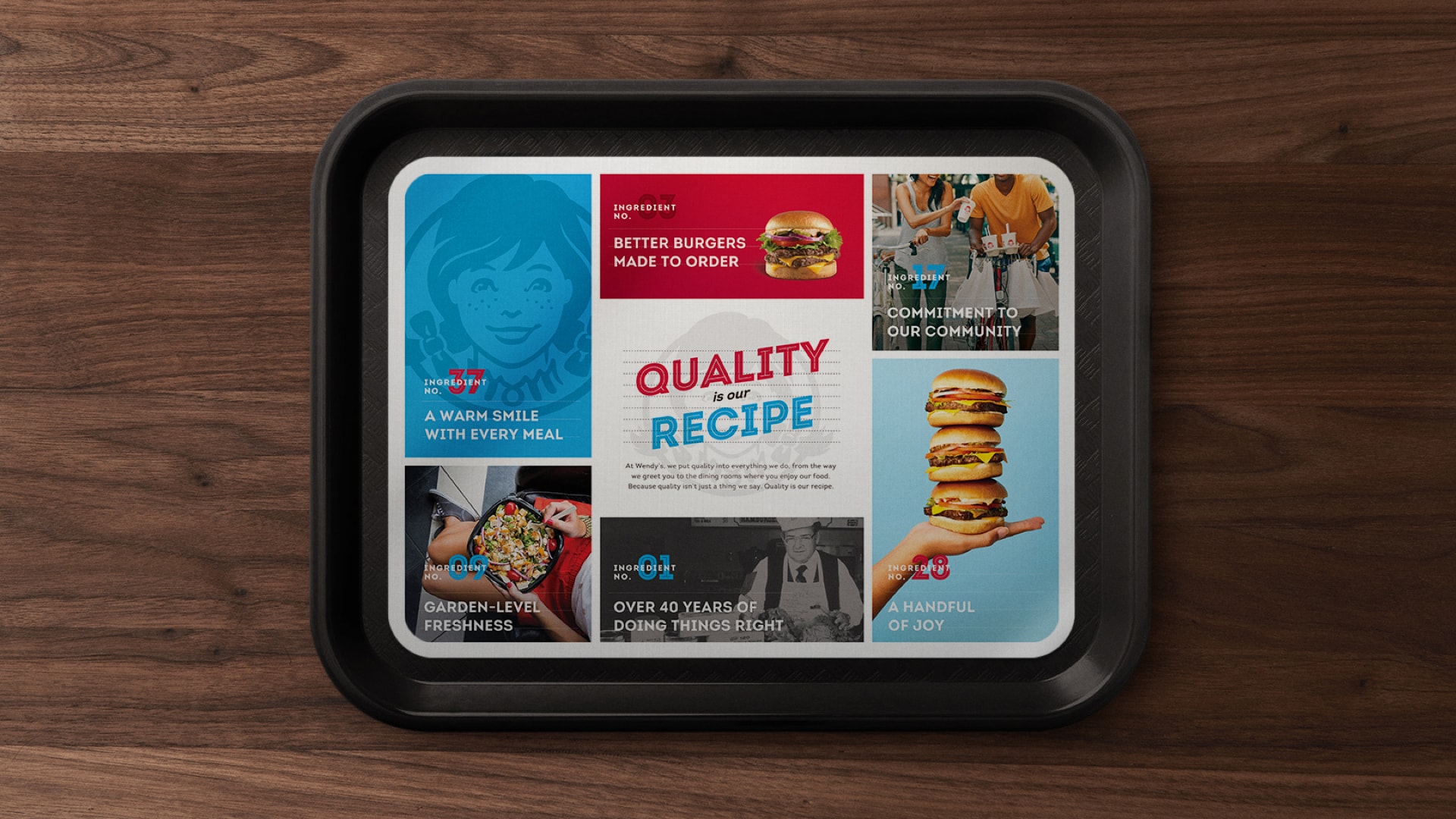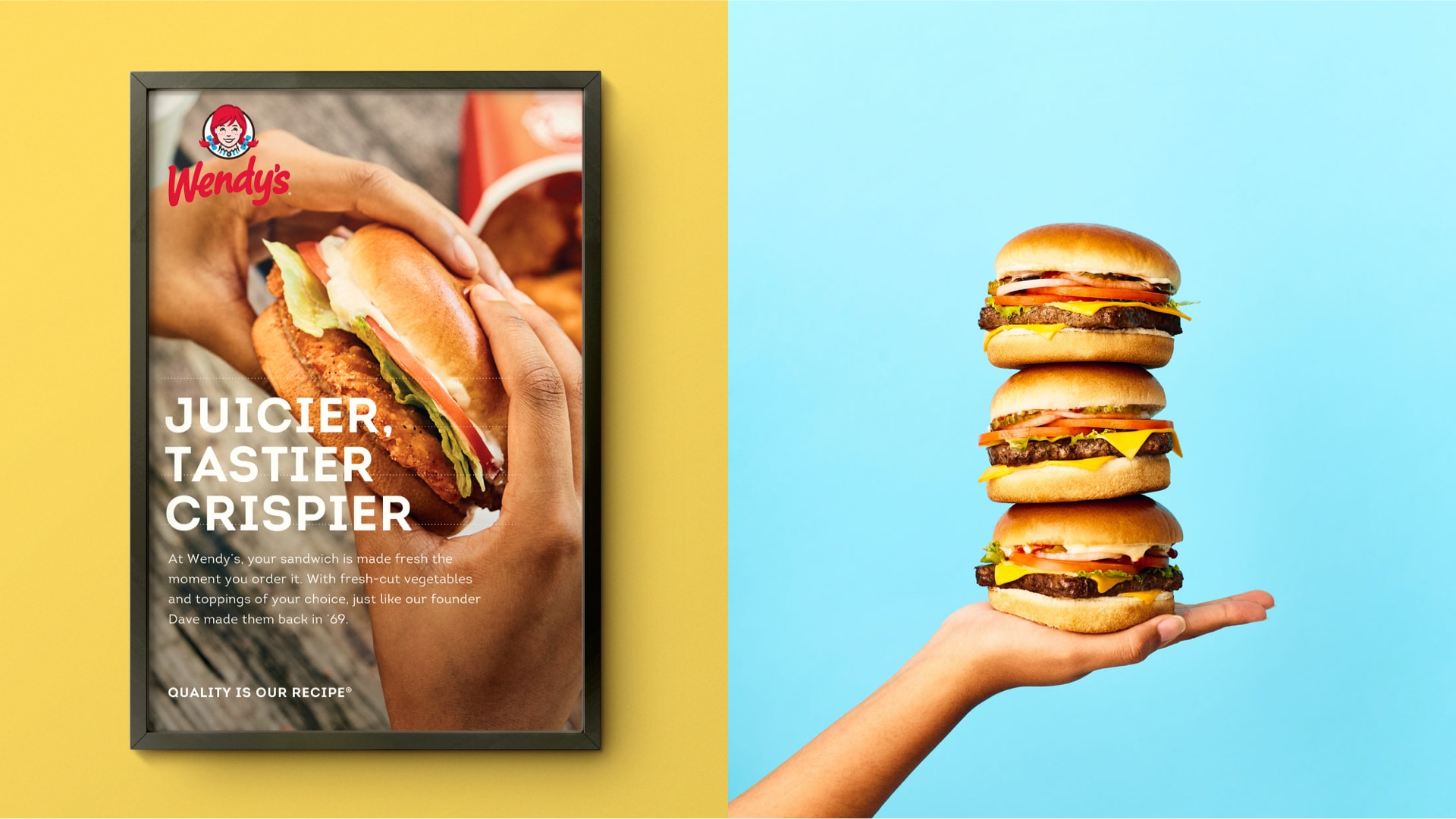 Colors and bold typography brings Wendy’s fresh and vibrant personality to the foreground while embracing their heritage and commitment to quality through video vignettes and photography.